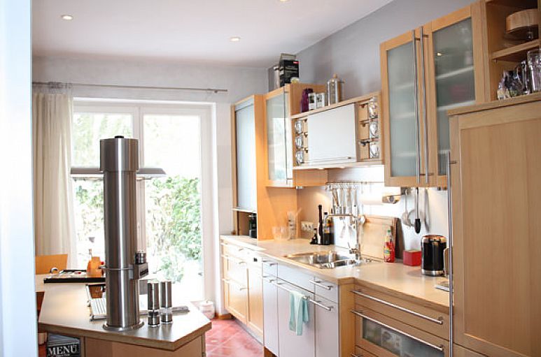 Das Haus wurde mit Kalksandsteinmauerwerk und weiß lackierten Holzfenstern erbaut. Im gesamten Haus wurden zahlreiche Downlights eingebaut. Die Verkabelung für eine Alarmanlage ist vorhanden. Der Eingangsbereich mit handgearbeiteten Zementfliesen und reizvoller Treppenanlage mit Einbauleuchten öffnet sich durch eine zweiflügelige Türanlage zum Wohn- / Essbereich mit 2,90 m Deckenhöhe. Wohn- / Essbereich mit 22 mm Massiv-Parkett aus Buchenholz und Design-Kaminofen. Doppelflügelige Schiebetüranlage zur Küche. Einbauten in Buche und Edelstahl, freistehendes Kochzentrum, Geräte Gaggenau und Siemens, Fußboden Zementfliesen. Im Obergeschoss befinden sich drei Zimmer und ein Bad. Die Endetage beinhaltet den Hauptschlafbereich mit Wintergarten, Dachterrasse, Schrankraum und Bad. Durch die Dachkonstruktion des Pultdaches betragen hier die Deckenhöhen bis zu über 3 m. Aufgrund des bis zum Boden verglasten Wintergartenvorbaues eröffnet sich aus dem Schlafbereich ein herrlicher Ausblick ins Grüne. Wintergarten in Holz- / Metallbauweise. Das Bad ist mit Zementfliesen und hochwertigen Sanitärobjekten ausgestattet. Vom Schlafbereich und aus dem Bad betritt man die intime Dachterrasse. Vollkeller mit ausgebautem Raum, Saunabereich, Duschanlage, Heizungs- und Abstellraum.