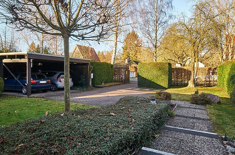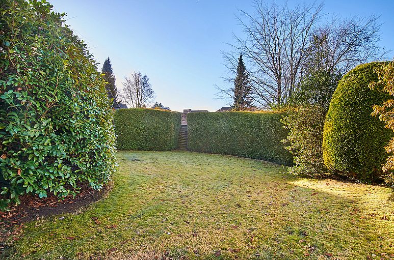 Das etwa 955 m² große Grundstück ist mit großer Rasenfläche, hohen Buchenhecken und Abpflanzungen pflegeleicht angelegt. Hinterer Gartenbereich mit guter Besonnung von Süden und Westen. Ruhige Wohnlage.