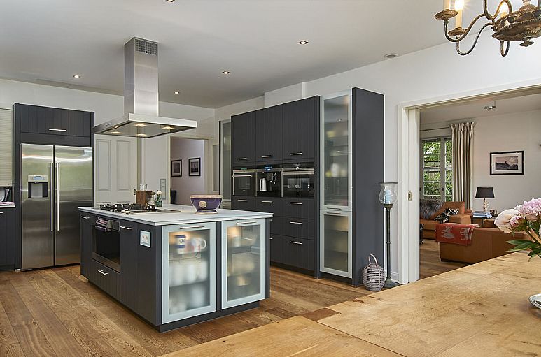 Großzügig ineinander übergehende Wohn- und Essräume im Erdgeschoss mit etwa 2,80 Deckenhöhen. Moderner Kamin mit versenkbarer Glasscheibe. Wohnbereich, Essbereich und Küche sind durch Schiebetüranlagen miteinander verbunden. Sehr aufwändig gestaltete Küche mit Platz für einen großen Esstisch. Küchenausstattung mit Arbeitsplatten aus Sicherheitsglas, breitem Gas-Kochfeld mit zusätzlicher Teppanyaki-Grillplatte, Dampfgarer, 90er Backofen + 60er Backofen mit Mikrowelle, großem Side-by-Side Kühlschrank mit Eiswürfelspender und Kaffee-Vollautomat. Geräte von Miele und Siemens. Moderne Bäder mit Deckenspots, großformatigen Fliesen, bodengleichen Duschen sowie hochwertigen Armaturen und Objekten u.a. von Dornbracht und Duravit. Eichendielen-Fußböden im gesamten Erdgeschoss, Treppen und Dielen. Fußbodenheizung in allen drei Wohngeschossen. Zentrale Belüftungsanlage. Holzsprossenfenster. Alarmanlage mit kompletter Aussenhautsicherung und Aufschaltung auf eine Wachzentrale. Vollkeller mit 2,40 m Raumhöhen inkl. großem Hobbyraum und Duschbad.