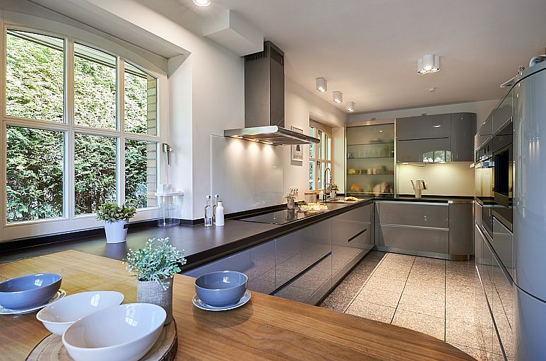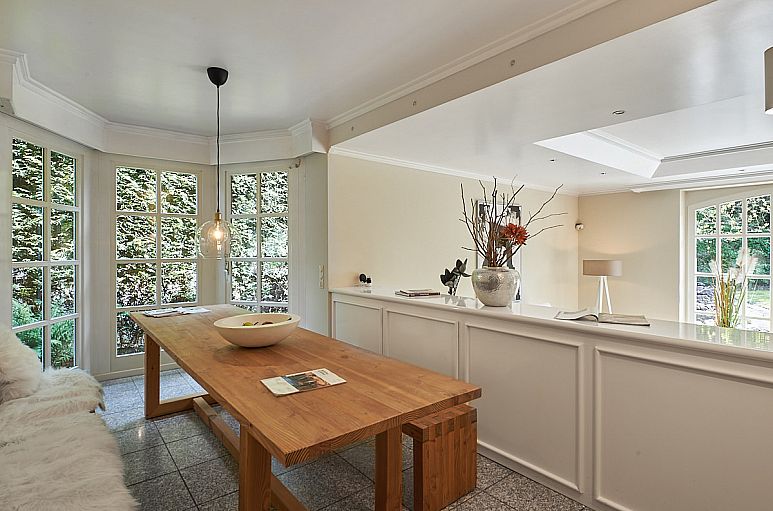 Das Dach ist mit Naturschiefer eingedeckt, Rotklinkermauerwerk. Holz - Sprossenfenster und -türen. Dank zahlreicher Modernisierungen bietet die Villa modernen Wohnkomfort. Entrée, Garderobe und Küche sind mit Granitplatten ausgestattet, die übrigen Räume im Erdgeschoss mit Holzdielenboden. Die Treppenhalle, der gemütliche Essplatz vor der Küche und der Wohn- / Essbereich mit Kamin gehen auf über 82 m² großzügig ineinander über und bieten alle einen wunderschönen Blick in den Garten. Die große Küche ist mit Einbauten und Geräten von Miele und Küppersbusch ausgestattet. Weiterhin befindet sich im Erdgeschoss ein separates Zimmer, ideal als Bibliothek oder Arbeitszimmer geeignet. Über eine breite Treppenanlage mit Holzgeländer gelangt man in das Obergeschoss. Hier befindet sich der Hauptschlafbereich mit zahlreichen Einbauten, Marmorbad und separatem WC sowie drei weitere Zimmer und zwei Bäder. Im ausgebauten Dachgeschoss sind zwei weitere große und hohe Räume, die sehr vielfältig nutzbar sind, und ein Duschbad. Vollkeller mit Fitnessraum, Heimkino mit großer Leinwand sowie weitere Vorrats- und Abstellräume. Garage. Das Haus verfügt über eine umfangreiche technische Ausstattung mit Sicherheitsrollläden, Kameraüberwachung, LED-Außenbeleuchtung, Heizstrahler, Tesla-Ladestation. Die Gasheizungsanlage von 2012 kann mit einer Wärmepumpe erweitert werden.