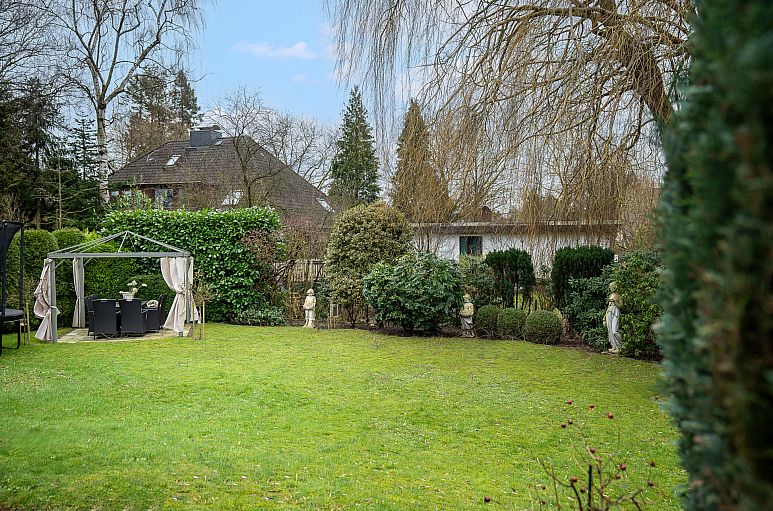 Das breite Grundstück verfügt über eine Größe von 800 m² und ist mit zahlreichen Abpflanzungen und Rasenflächen pflegeleicht angelegt. Zufahrt und Zuwegung in Granitpflaster.
