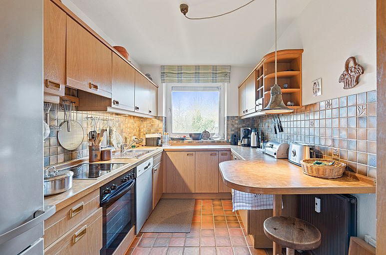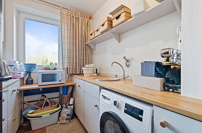 Das Entrée mit Garderobe und die Diele sind mit einem Schienensystem mit Deckenstrahlern ausgestattet. Weiße Fenster und Türen. Zahlreiche angefertigte Schrankeinbauten von der Firma IP20. Großzügiger Wohn-/ Essbereich mit Ausgang auf die sehr geschützt, im Winkel des Hauses gelegene Loggia mit herrlichem Weitblick ins Grüne. Zwei weitere, sehr reelle Zimmer. Zimmer I mit Ausgang auf eine weitere Loggia I mit Abstellraum. Küche mit Einbauten. Daneben ein separater Hauswirtschaftraum mit Anschlussmöglichkeit für Waschmaschine und Trockner. Vollbad mit Wanne sowie Gäste-WC mit Dusche, weiße Objekte und Chrom-Armaturen. Fußböden von Entrée, Diele, Küche, Hauswirtschaftsraum und Bädern einheitlich mit Terracotta-Fliesen. Ein großer Kellerraum mit guter Belichtung. Ein Carport-Stellplatz für einen PKW auf der vorgelagerten Hoffläche gehört zu der Wohnung.