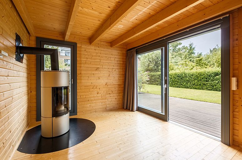 zzgl. Saunahaus im hinteren Gartenbereich mit reizvollem Holzdeck.