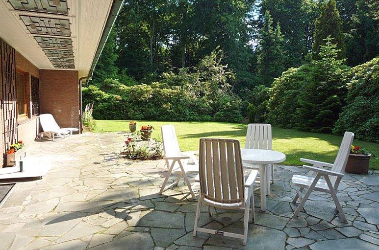 Das Dach ist bisher nicht ausgebaut und bietet erhebliche Reserven. Die Decke Erdgeschoss / Dach ist bereits als geschüttete Betondecke ausgeführt. Von Haus, Terrasse und Garten genießt man einen herrlichen Blick auf den Volksdorfer Wald, Haus und Garten in Süd-West-Ausrichtung. Große, teilweise überdachte Terrassenanlage in Süd-West-Lage. Außenkamin.