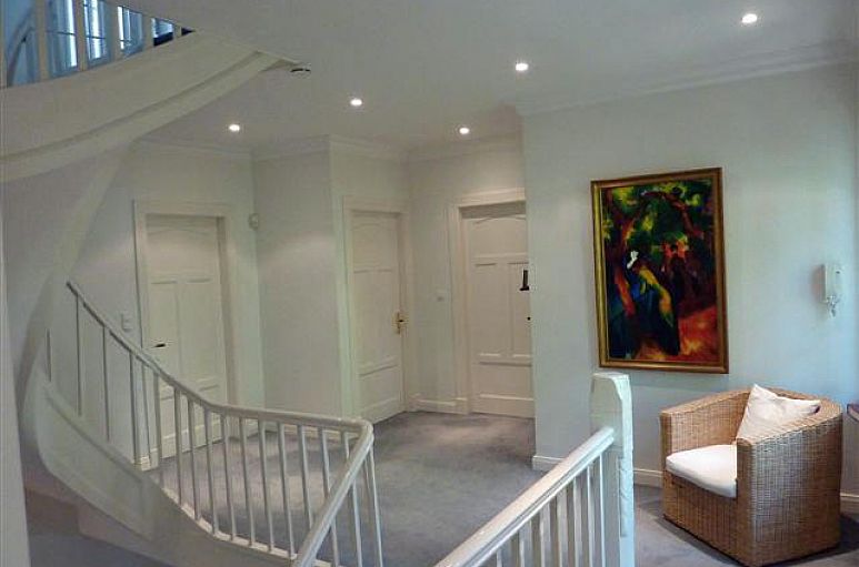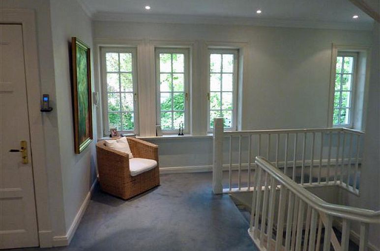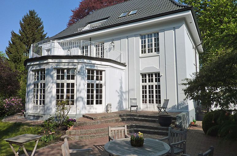 1992 wurde die Villa mit Beauftragung eines Architekten sehr behutsam und umfassend saniert: Vollständige Erneuerung von Heizungsrohren, Wasser, Abwasser und Elektroinstallationen. Die gusseisernen Heizkörper sind sorgfältig aufgearbeitet oder erneuert worden. Anthrazitfarben engobierte Doppel- S-Tonpfannen von Meyer-Hohlsen, Kupfer-Regenrinnen. Nach den ursprünglichen Vorbildern angefertigte, weiß lackierte Holzsprossenfenster und -türen aus Hartholz mit Futter und Bekleidung. Viele Elemente sind zweiteilig mit Lüftungsklappen ausgeführt. Besonders schön und selten ist die Decke im Wohnraum mit dem dezent sichtbarem, tragenden Gebälk, weiß lackiert, mit umlaufendem Zierprofil. Weitere Räume mit Stuckprofilen. Hauptbad mit separatem WC, Tischlereinbauten und zwei Waschbecken, in eine Granitplatte eingelassen. Im I. Obergeschoss stehen drei großzügige Zimmer mit etwa 29, 27, und 17 m² zur Verfügung, die beiden erstgenannten mit Austritt auf den 27 m² großen Süd-Balkon, der nahezu den ganzen Tag besonnt wird. Eine weitere Besonderheit des Hauses ist das etwa 34 m² große und bis zu 5 m hohe Zimmer im Dachgeschoss, das bis in die Dachspitze geöffnet ist. Dieser Bereich ist für viele Zwecke geeignet (z.B. für ältere Kinder, Gäste, Privatbüro). Alarmsystem mit Außenhautsicherung.