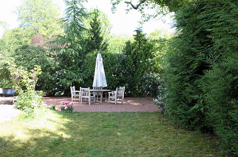 Das breite Grundstück mit einer Größe von 1.496 m² verfügt zum hinteren Garten hin über eine Süd-Ausrichtung. Zur Straße hin ist das Grundstück angenehm abgeschirmt mit zahlreichen Abpflanzungen und einem großzügigen Vordergarten. Hoher Metallzaun und elektrische Toranlage mit gemauerten Pfeilern. Zahlreiche Rhododendren und Abpflanzungen. Terrassenanlage auf zwei Ebenen.