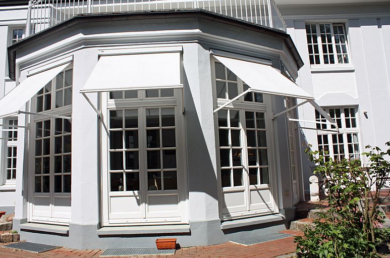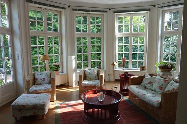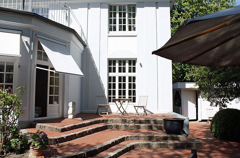 Wunderschöne Sprossenfenster und - türen prägen das Bild der symmetrisch aufwändig gegliederten Fassade, die in hellen Grautönen 2010 neu gestrichen worden ist. Eingangshalle mit Empore und reizvoller Holztreppenanlage. Hohe Decken, original erhaltene Innentüren. Erdgeschoss mit aufgearbeitetem Fischgrat- Parkettböden und Hamburger Fußleisten. Der in einem Halbkreis vor dem Wohn- / Essbereich angelegte originale Wintergarten schafft auf sehr charmante Weise den Übergang zu Terrassenanlage und Garten.