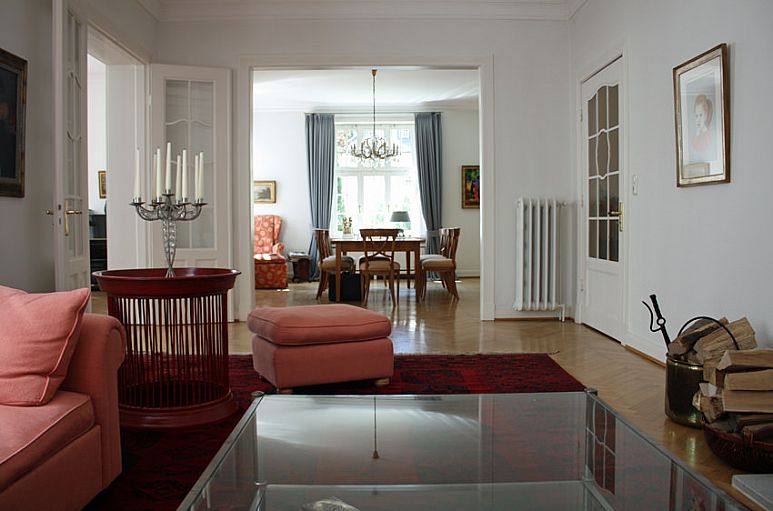 Die zweigeschossige Villa mit verputzter Fassade und Walmdach wurde 1909 erbaut. Zahlreiche alte Stilelemente, hohe Decken und großzügige, lichtdurchflutete Räume schaffen eine ganz besondere Atmosphäre.
